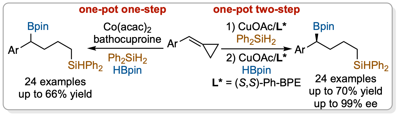 37. Tan, B. B.; Ge, S.* “One-Pot Cobalt- or Copper-Catalyzed Asymmetric Ring-Opening Hydrosilylation/Hydroboration of Arylidenecyclopropanes” Angew. Chem. Int. Ed. 2025, 64, e202419522. [doi].